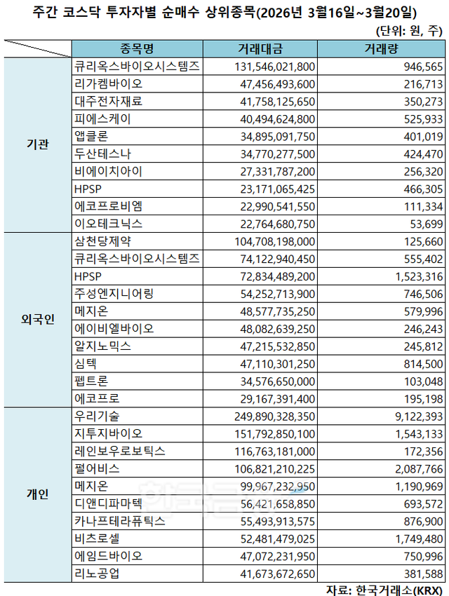 기관 'SK하이닉스'·외인 '두산에너빌리티'·개인 '현대차' 1위 [주간 코스피 순매수- 2026년 3월16일~3월20일]