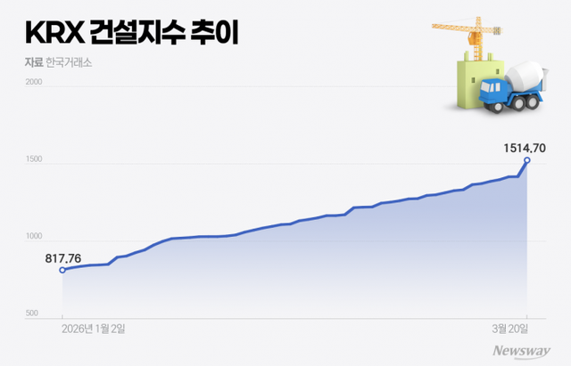 지난해 마지막 거래일 824.65로 마감한 KRX건설 지수는 전 거래일 종가 기준 1514.70을 기록하며 83.67%의 상승률을 보였다. 이는 같은 기간 코스피 상승률(37.18%)의 두 배 이상을 웃도는 수치다.