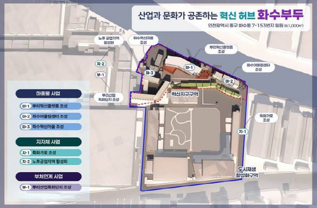 이번 사업은 총사업비 1233억여원(국비 256억원+시비 125억원+구비 135억원+기타 717억원)을 투입하는 대규모 프로젝트로 화수부두 일원을 산업·상업·주거 기능이 집적된 복합경제거점으로 만드는 것이다. 핵심 사업으로는 마중물 사업인 뿌리혁신플랫폼, 화수어울림센터, 화수혁신마을 조성과 동구 특화가로 조성, 노후공업지역 활성화 사업을 한다. 중앙 부처 연계사업으로 뿌리산업특화단지 조성도 추진한다.