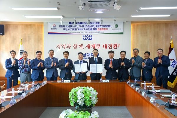 23일 오전 11시 본관 2층 대회의실에서 열린 협약식에서 대전방산사업협동조합 이계광 이사장과 한남대 이승철 총장이 대학 AI최첨단 인프라를 기반으로 기업 네트워크를 연계하는 상호 업무협약서를 교환했다. 협약에 따라 대전방산사업협동조합은 한남대의 AIGPU거점센터 사업에 참여하는 한편, 인프라를 공동 활용하게 되며, 국방AX대학원 내에 채용 조건형과 재교육형 학위과정 운영을 통해 조합 회원사가 채용을 보장하는 계약학과 형태의 ‘채용연계형’ 트랙을 최우선으로 실행하게 된다.