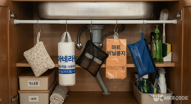 압축봉은 싱크대 아래 수납장 안쪽에 설치하면 공간을 위아래로 나눠 쓸 수 있다. 고리 간격을 일정하게 맞춰두면 봉지가 겹치지 않아 꺼낼 때도 편하다.