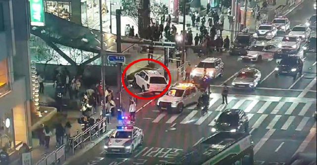 23일 서울 마포소방서에 따르면 이날 오후 7시 10분께 흰색 SUV 차량이 건널목을 넘어 인도로 들어와 홍대입구역 출구 앞에 멈춰서는 사고가 났다.