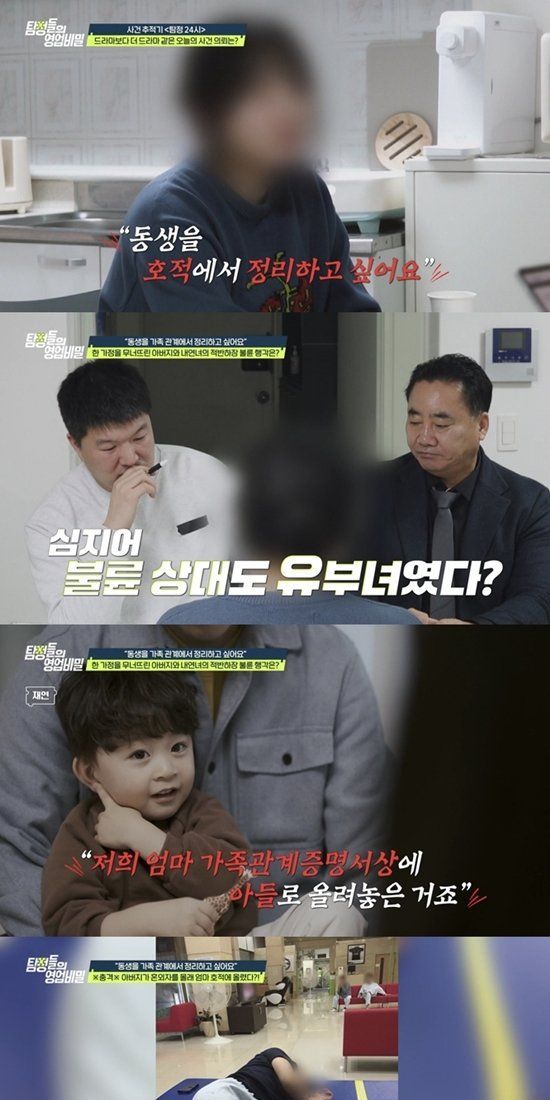 지난 23일 방송된 채널A ‘탐정들의 영업비밀’ ‘탐정 24시’에서는 “동생을 호적에서 정리하고 싶다”는 의뢰가 소개됐다. 의뢰인은 중학생 시절 아버지의 외도로 부모가 이혼했고, 이후 아버지가 내연녀와의 사이에서 태어난 아이를 자신의 어머니 친자로 호적에 올렸다는 사실을 뒤늦게 알게 됐다고 털어놨다.