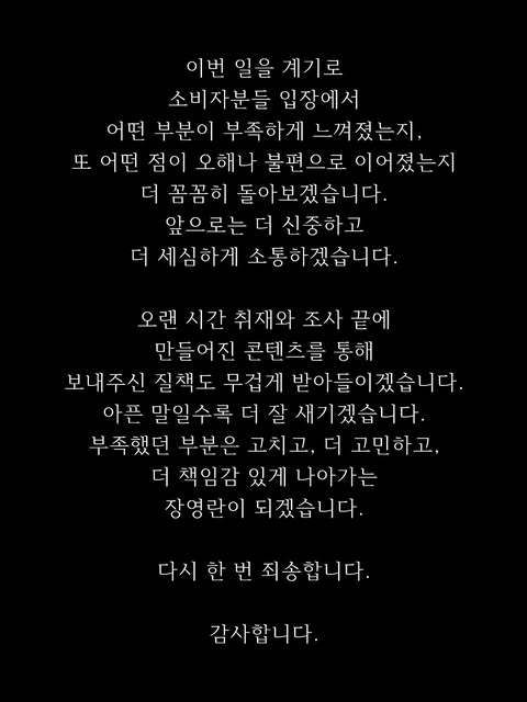 장영란은 “이번 일을 계기로 소비자 입장에서 부족했던 점과 오해를 돌아보겠다”며 “보내주신 질책도 무겁게 받아들이고 더 책임감 있게 나아가겠다”고 밝혔다.