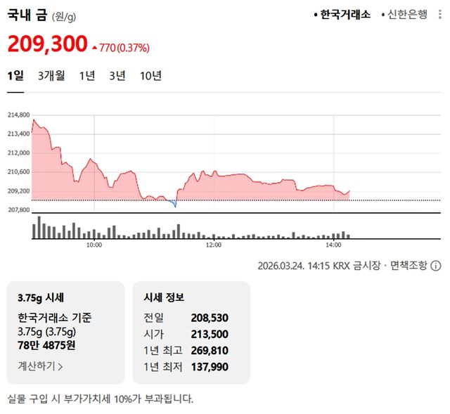 국내 금시세(금값)가 24일(한국 시각) 오후 상승세(전 거래일 대비)를 보이고 있다.