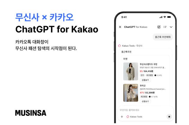 무신사가 카카오의 챗지피티 포 카카오(ChatGPT for Kakao) 서비스를 통해 사용자의 일상적인 대화 맥락에 맞춰 최적의 패션 아이템을 제안하는 대화형 커머스 환경을 구축하고 패션 데이터 기반의 인공지능 추천 서비스를 정식 론칭했다.