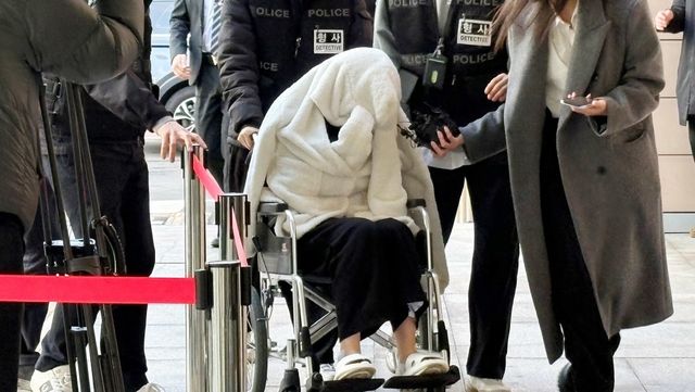 약물을 투약한 상태로 차량을 몰다 반포대교 난간을 뚫고 추락한 30대 여성 A씨가 지난달 27일 서울서부지법에서 열린 구속 전 피의자 심문(영장실질심사)에 휠체어를 타고 출석하고 있는 모습. / 뉴스1-소봄이 기자