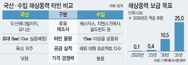 대표적으로 풍력발전 핵심 부품인 터빈을 생산하는 국내 제조사는 두산에너빌리티(034020)와 유니슨(018000) 2곳뿐이고 그나마 해상풍력용 8메가와트(㎿)급 터빈 공급 실적이 있는 곳은 두산에너빌리티 1곳뿐이다. 그나마 국제적으로 통용되는 15㎿급에는 크게 못 미쳐 외국산 대비 경제성이 떨어질 수밖에 없다.