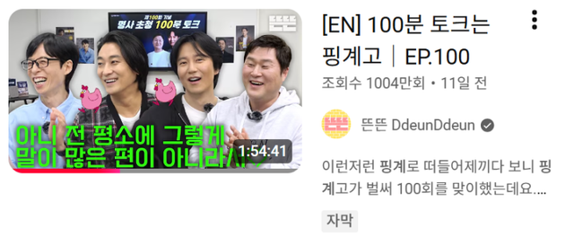 26일 기준 유튜브 채널 ‘뜬뜬’의 ‘100분 토크는 핑계고’ 조회수는 1004만 회를 기록했다. 공개 11일 만에 달성한 수치다.