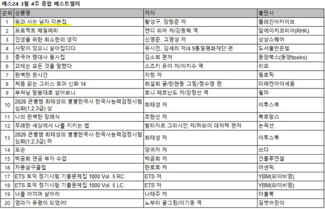 3월 4주 종합 베스트셀러 순위. / 예스24 제공