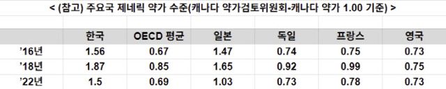 그동안 국내 제네릭 가격은 주요국 대비 높은 수준으로 평가돼 왔다. 실제로 국제 비교에서 한국 제네릭 가격은 경제협력개발기구(OECD) 평균의 2배 이상 수준으로 나타나 가격 거품 논란이 지속돼 왔다. 정부는 이러한 구조를 개선해 건강보험 재정 부담을 줄이고 가격 경쟁을 유도한다는 방침이다.