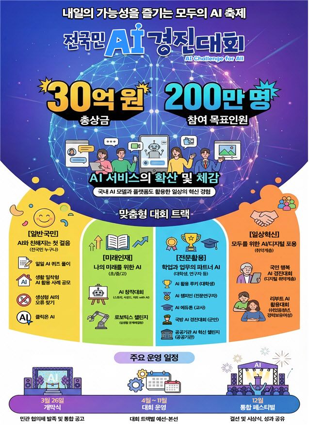 정부는 이번 대회를 단발성 이벤트가 아니라 국민의 AI 활용 문화를 넓히는 출발점으로 삼겠다는 방침이다. 대회 상세 정보와 참가 신청은 26일 개설된 통합 홈페이지에서 확인할 수 있다.