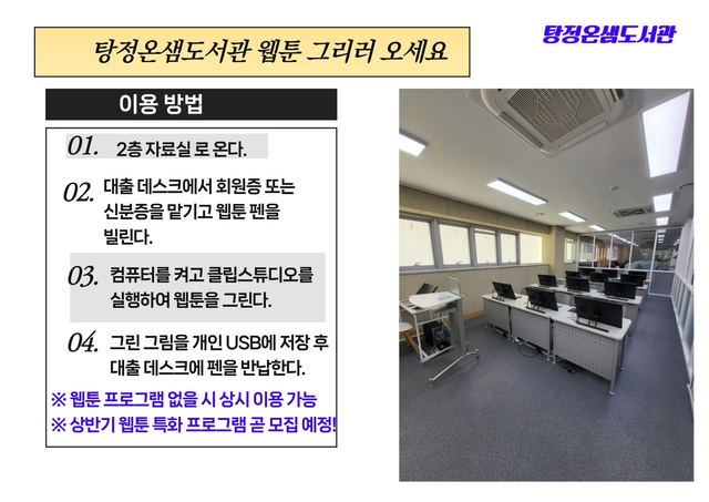 충남 아산시 탕정온샘도서관이 시민들의 창작 활동을 지원하기 위해 전문 장비를 갖춘 웹툰창작실을 조성하고 운영을 시작한다. 액정 태블릿과 드로잉 프로그램 등 숙련자까지 이용 가능한 인프라를 구축해 지역 주민 누구나 웹툰 기획과 제작을 경험할 수 있다.