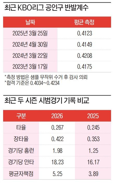 한 구단 관계자는 "이유를 불문하고 홈런이 늘었다는 건 팩트"라며 "시범경기 기조가 유지되면 정규시즌에도 영향을 미칠 수 있다"고 말했다. 이에 KBO는 관련 의혹을 해소하기 위해 공인구 수시 검사를 의뢰한 상태다. KBO 관계자는 "검사 결과는 30일에 나올 예정"이라고 밝혔다.