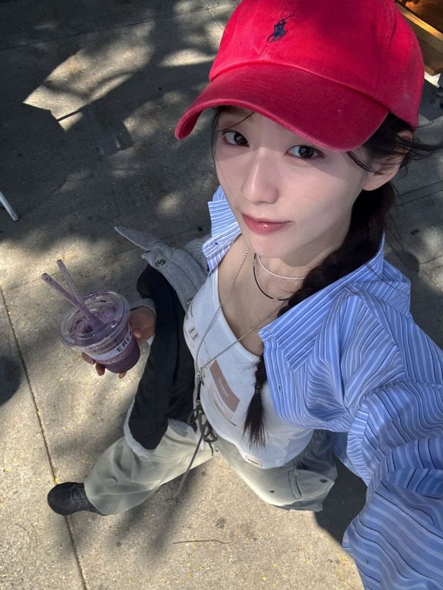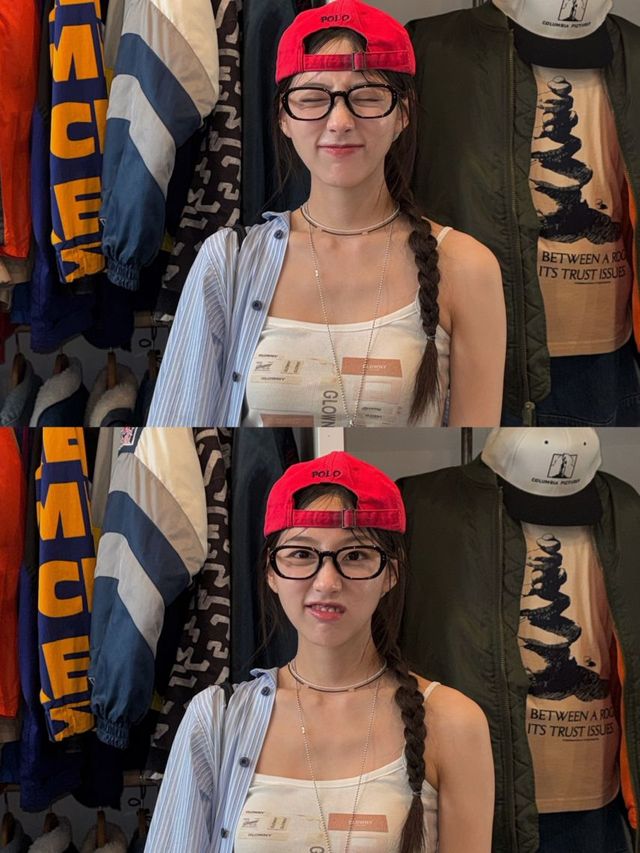 룩의 첫인상을 결정짓는 가장 강력한 포인트는 선명한 레드 컬러의 볼캡입니다. 정예인은 캡을 뒤로 눌러써 활동적인 이미지를 주는 동시에, 볼드한 검은색 뿔테 안경을 매치하여 무심한 듯 시크한 '너디 시크' 룩의 정석을 보여줍니다. 캡 밑으로 정갈하게 땋아 내린 댕기 머리 스타일은 스포티한 의상과 유니크한 조화를 이룹니다.