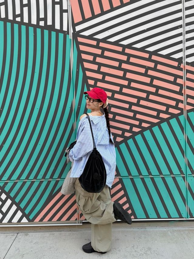 소품과 배경의 조화 또한 인상적입니다. 어깨에는 부드러운 질감의 블랙 벨벳 복조리(드로스트링) 백을 착용하여 스포티한 룩에 따뜻한 텍스처를 더했으며, 배경이 된 **민트, 핑크, 화이트 색상의 기하학적이고 그래픽적인 벽면 패턴**은 인물의 역동적인 포즈와 강렬한 레드 캡 컬러와 어우러져 한 편의 감각적인 팝아트 같은 미장센을 완성합니다.
