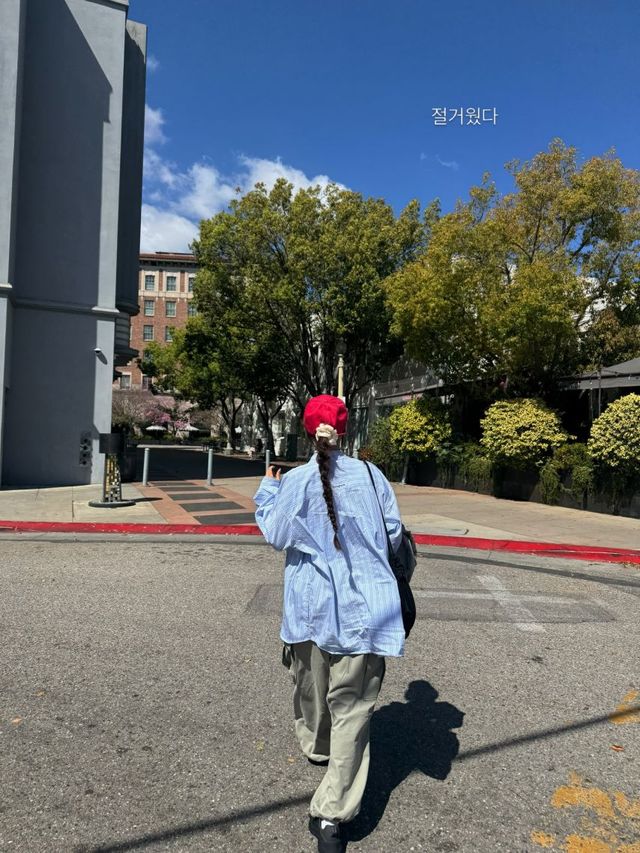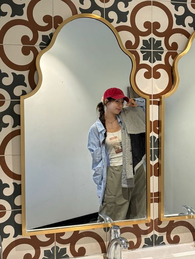 의상은 편안함 속의 스타일리시함을 지향합니다. 상의로는 화이트 톱 위에 블루 스트라이프 루즈 핏 셔츠를 한 쪽 어깨만 자연스럽게 걸쳐 내추럴한 멋을 살렸으며, 하의로는 트렌디한 베이지 톤의 와이드 카고 팬츠를 착용하여 볼륨감 있는 실루엣을 완성했습니다. 팬츠의 루즈한 핏과 스포티한 블랙 스니커즈의 조화는 힙한 스트릿 감성을 극대화합니다.
