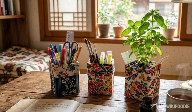 우유팩 겉면에 시트지나 천 조각을 붙이면 책상 위 소품 정리함으로 쓸 수 있다. 굴러다니는 펜이나 가위, 자 같은 문구류를 꽂아두기에 크기가 딱 맞고, 여러 개를 나란히 세워두면 책상 위 정리가 한결 수월해진다. 원하는 패턴의 시트지를 붙이면 시중에서 파는 펜꽂이 못지않은 모양새가 나온다.