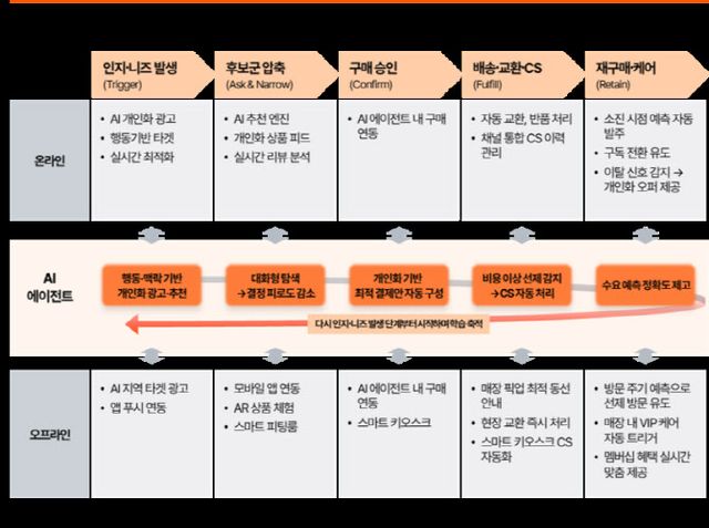 보고서에 따르면 AI 에이전트 도입 이후 유통 산업에서는 고객의 구매 과정이 근본적으로 재편되고 있다. 기존에는 인지·탐색·비교·결제·사후관리 등 단계별로 분절된 구조로 이뤄졌다면, 이제는 ‘인지·니즈 발생(Trigger)-후보군 압축(Ask & Narrow)-구매 승인(Confirm)-배송·교환·CS(Fulfill)-재구매·케어(Retain)’로 이어지는 통합 구조로 전환되고 있다. 이 과정에서 고객과의 모든 상호작용이 데이터로 축적되고 학습되면서, 경쟁의 핵심은 더 이상 가격이나 채널 노출이 아니라 구매 과정을 장악하는 에이전트 역량으로 이동하고 있다.