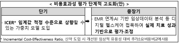 먼저 희귀질환 치료제 등재기간은 100일 이내로(현재 최대 240일) 단축해 급여된 치료제에 대해서는 신속하게 임상적 성과를 정밀히 평가하고 급여에 반영하는 체계를 구축한다. 아울러 치료성과를 기반으로 약제 가치를 평가하는 비용효과성 평가체계 고도화도 단계적으로 추진한다는 방침이다.