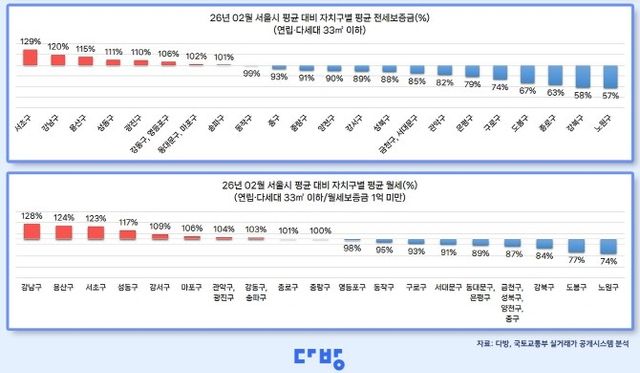 부동산 플랫폼 다방이 국토교통부 실거래가 바탕으로 서울 25개 자치구 연립·다세대 원룸 전월세 수준을 분석한 '2월 다방여지도'에 따르면, 보증금 1000만원 기준 서울 원룸 평균 △전세 보증금 2억1469만원 △월세 67만원이다. 이는 전월 대비 각각 △전세보증금 0.8%(172만원) △월세 4.5%(3만원) 하락한 수치다. 서울 평균 전세보증금과 월세가 동시에 하락한 건 지난해 10월 이후 4개월 만이다.