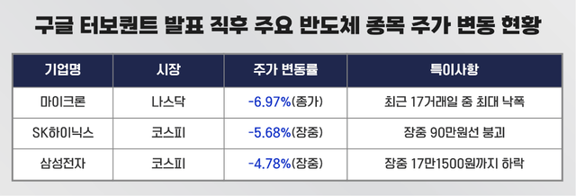 구글 발표 직후 AI 시장의 주도권이 하드웨어 성능에서 소프트웨어 알고리즘으로 옮겨갈 수 있다는 우려가 생겨나면서 세계 각국의 반도체 기업 주가는 일제히 하락했다. 26일(현지시간) 마이크론은 전일 대비 6.97% 급락하며 장을 마감했고 27일 국내 증시에선 삼성전자와 SK하이닉스가 각각 장중 4.78%, 5.68%까지 하락했다. 특히 SK하이닉스 주가는 장중 한 때 90만원선이 무너졌다. 미국의 이란 폭격 소식이 알려졌던 지난 9일 이후 18일 만이다. 삼성전자 주가 또한 장중 17만1500원까지 하락했다.