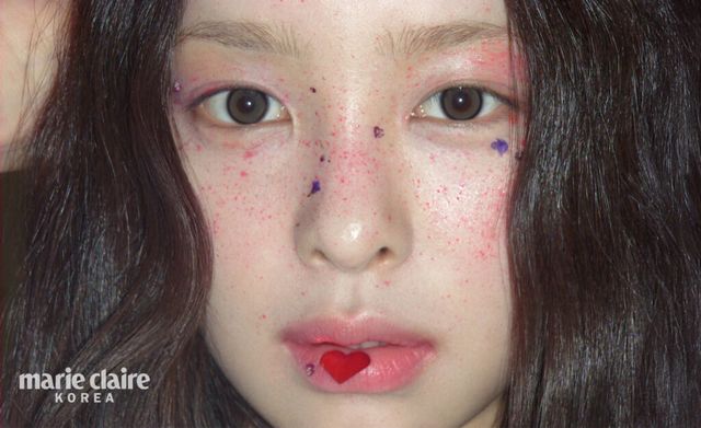 얼굴 위에 번지듯 스민 핏빛 기운을 은유적으로 표현한 주근깨 메이크업은