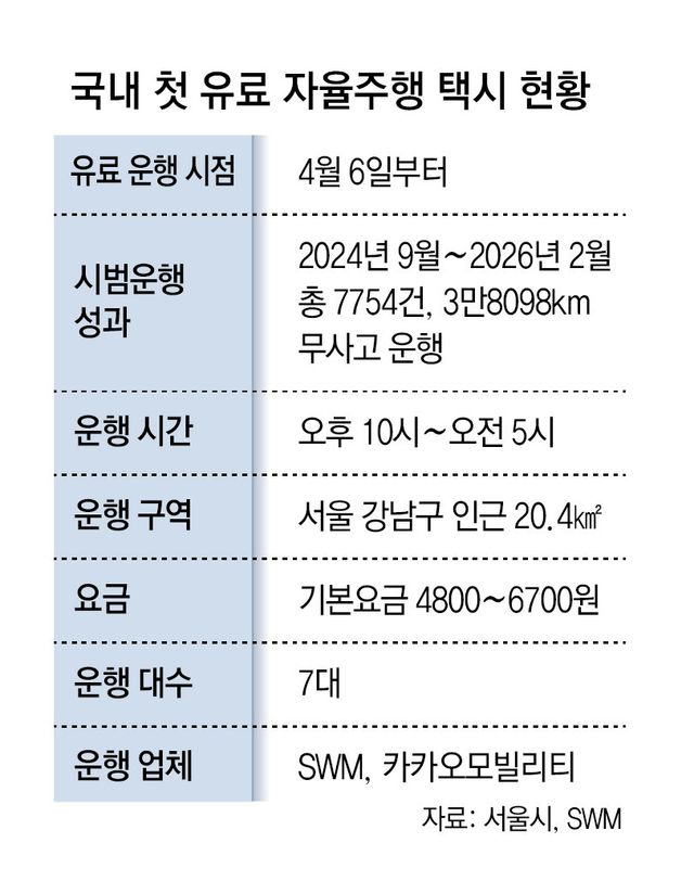 27일 서울시에 따르면 강남구와 서초구 일대 20.4㎢ 지역에서 무상 운행하던 자율주행 택시가 다음 달 6일부터 국내에서 처음으로 유료 운송으로 전환한다. 시간대에 따라 기본요금 4800∼6700원을 받는 것. 서울시는 운행 차량을 현행 3대에서 7대로 늘리고 운행 시작 시간도 기존 오후 11시에서 10시로 앞당겼다. 서울시 관계자는 “하반기(7∼12월)에는 자율주행 차량을 20대까지 늘리고, 주간에도 운행하는 방안을 검토 중”이라고 말했다.