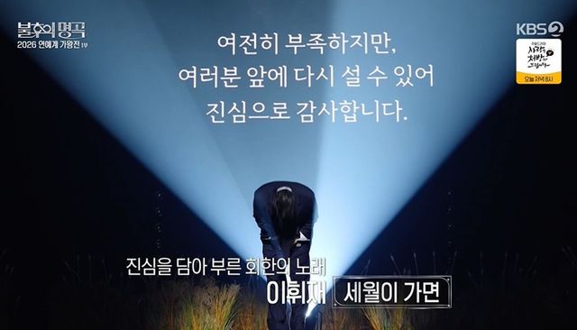 무대에 오른 이휘재는 “감사하고 죄송하고 여러 감정이 교차한다. 제가 방송국에 와서 제 이름이 다시 띄워질 거라곤 (생각 못 했다)”라고 눈물을 보였다. “가사에 맞게 ‘저 친구가 4년 동안 생각 많이 하고 나왔나 보다’ 알아주시면 좋겠다”는 바람으로 무대를 선보인 이휘재.