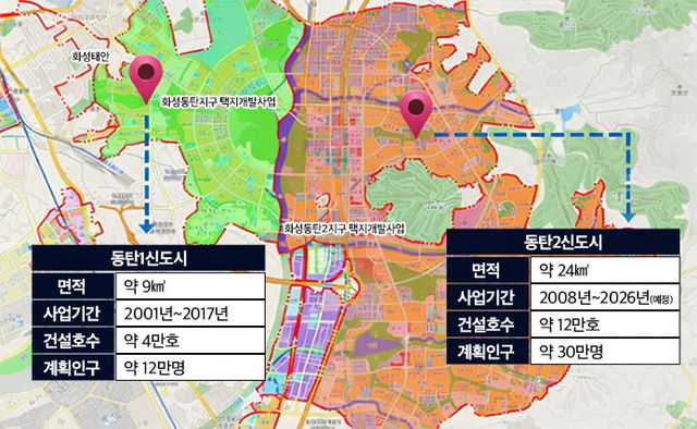 경기 화성시 일대에 조성된 동탄신도시는 1·2신도시로 나뉘어 단계적으로 개발이 진행됐다. 2004년 분양을 시작한 동탄1신도시는 약 9㎢ 규모로 조성돼 2007년부터 입주가 이뤄졌으며, 총괄계획가(MP) 제도 도입과 U-시티 개념 적용 등으로 초기 신도시 개발 모델을 제시했다. 이후 광역교통망 확충과 기반시설 구축을 통해 약 12만명 규모의 주거지로 자리 잡았다.