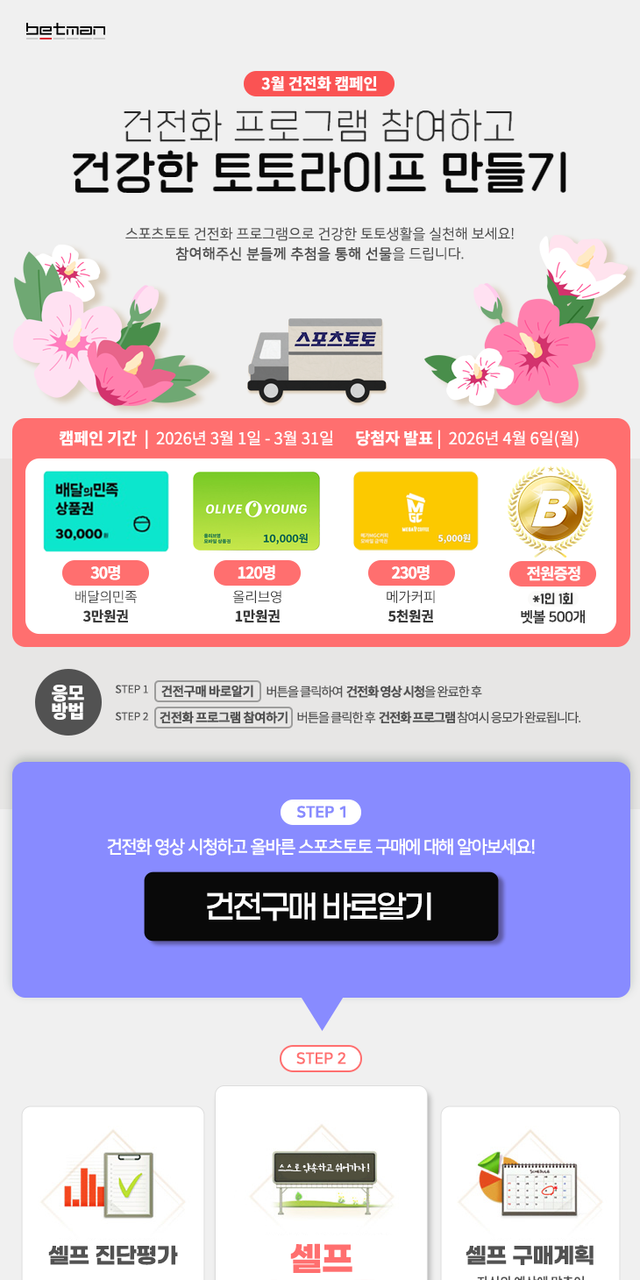 ‘건전구매 바로알기’와 세 가지 ‘건전화 프로그램’을 완료한 참여자들은 이번 이벤트에 자동으로 응모되며, 추첨을 통해 배달의 민족 3만 원 권(30명), 올리브영 1만 원 권(120명), 메가커피 5000원 권(230명)을 증정한다. 더불어 이벤트 참여자 전원에게는 1인 1회에 한해 벳볼 500개도 지급된다.