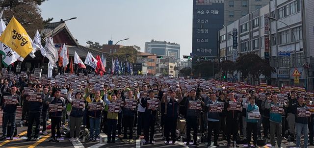 전국민주노동조합총연맹(민주노총)은 지난 28일 제주시 관덕정 앞에서 '4·3민중항쟁 78주년 정신계승 전국노동자대회'를 열었다. 이날 대회에는 3500여 명(주최 측 추산)의 조합원들이 참가했다.