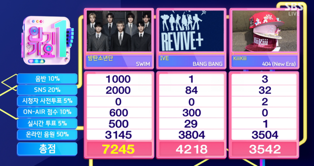 이날 방탄소년단은 음반(10%) 1000점, SNS(20%) 2000점, 시청자 사전투표(5%) 0점, 온에어 점수(10%) 600점, 실시간 투표(5%) 500점, 온라인 음원(50%) 3145점, 총 7245점으로 1위를 기록했다. 2위 아이브는 4218점, 3위 키키는 3542점을 기록했다.
