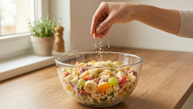 온라인에서 과일 사라다의 맛을 한층 끌어올리는 간단한 비법이 공유됐다. 특별한 재료나 어려운 과정이 필요한 것도 아니다. 집에 흔히 있는 재료 하나만 추가하면 식당에서 먹던 그 맛에 한 발짝 더 가까워질 수 있다는 점에서 관심이 모인다. 비법은 바로 '빵가루'다.
