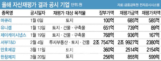 앞서 머큐리도 인천 가좌동 토지 재평가를 통해 약 100억원 수준이던 장부가를 685억원으로 끌어올리며 585억원 규모의 재평가잉여금을 기타포괄손익에 반영한다고 1월 공시했다. 이 외에도 서부T&D는 투자부동산과 유형자산을 포함한 대규모 자산 재평가를 통해 약 2380억원 규모의 차익을, 제이케이시냅스는 토지와 건물, 투자부동산 등을 포함한 자산 재평가를 통해 약 167억원 규모의 차익을 반영했다.