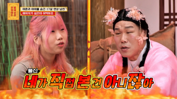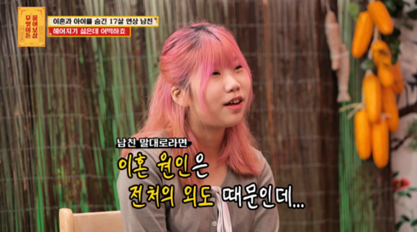 고민녀는 남자친구와 함께 있던 중 그가 낯선 여성과 채팅을 하는 모습을 목격했고, 이를 추궁하자 일주일에 두세 번 연락하는 여자라는 황당한 답변을 들었다고 밝혔다. 의구심이 커진 고민녀가 남성의 휴대전화를 확인한 결과, 그가 이혼남이라는 사실은 물론 전처와 아들 셋이 함께 찍은 사진과 대화 내용을 발견하게 됐다. 특히 두 사람은 이혼 후에도 서로를 여보라고 부르고 있어 스튜디오를 경악케 했다.