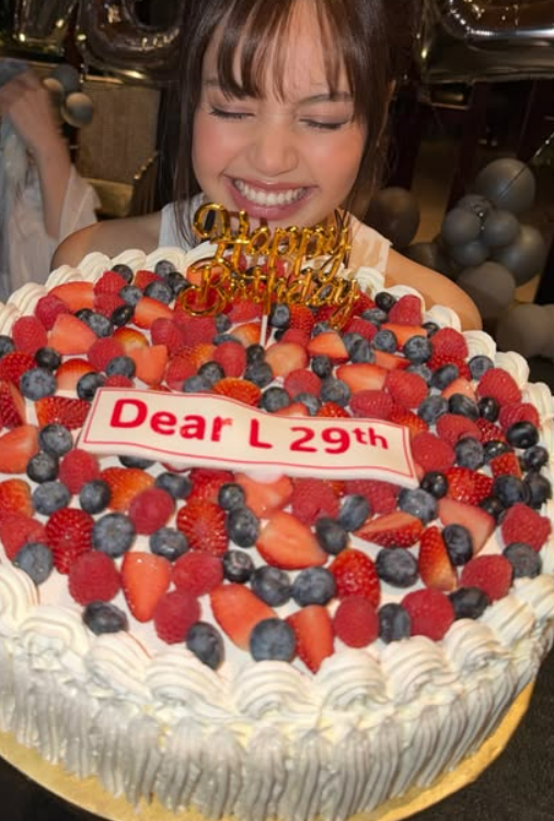 리사는 딸기와 블루베리가 가득 올라간 대형 케이크 앞에서 환한 미소를 지으며 행복한 순간을 만끽했다.