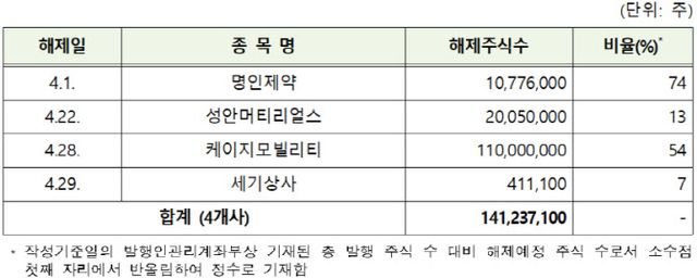 유가증권시장에선 KG모빌리티(003620)의 해제 물량이 1억 1000만주로 가장 많았다. 이어 성안머티리얼스(011300) 2005만주, 명인제약(317450) 1077만 6000주, 세기상사(002420) 41만 1100주 순이다. 발행주식 수 대비 비중으로는 명인제약이 74%, KG모빌리티가 54%로 상대적으로 높았다.