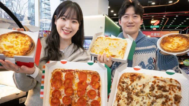 모델들이 세븐일레븐의 1인가구 피자를 소개하고 있다. / 세븐일레븐