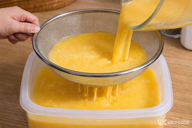 4. 부드러운 식감을 위해 계란물을 체에 한 번 걸러 전자레인지용 그릇에 옮겨 담는다.