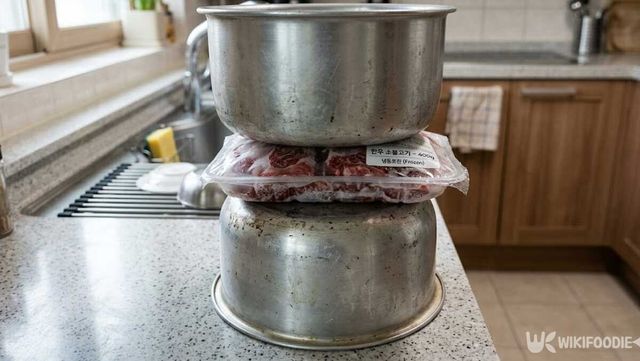 방법 자체는 복잡하지 않다. 냄비 하나를 뒤집어 평평한 바닥면이 위를 향하게 놓고, 냉동 고기를 포장 상태 그대로 그 위에 올린 뒤 다른 냄비를 정방향으로 덮으면 고기가 두 냄비 바닥 사이에 끼인 형태가 된다. 이렇게 하면 고기의 위아래 면이 동시에 금속과 밀착되면서 열 이동이 양쪽에서 함께 이뤄진다.
