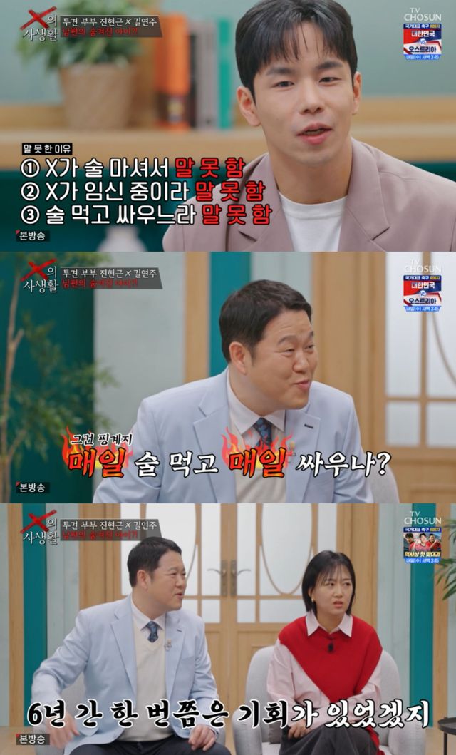 이에 남편은 "X에게 진지하게 얘기하려고 하면 X가 술을 먹거나 임신 중이었다. 그리고 애 앞에서 술먹고 싸우고 타이밍 놓쳤다"고 진작 밝히지 못한 이유를 전했고, 김구라는 "매일 싸우고 매일 술 먹냐. 이건 변명의 여지가 없다"고 단호히 답했다.