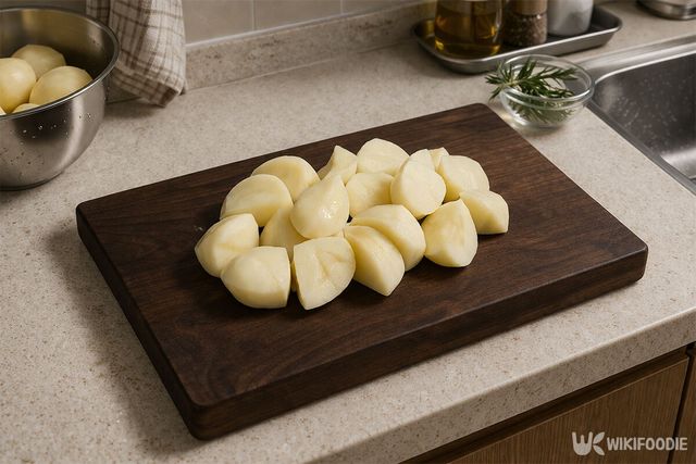 조리는 감자 380g을 작게 썰어 믹서기에 넣는 것부터 시작한다. 여기에 물 70ml와 소금 2꼬집을 넣고 입자가 보이지 않을 정도로 곱게 간다. 물 양이 너무 많으면 반죽이 묽어지므로 정해진 양을 지키는 것이 좋다.