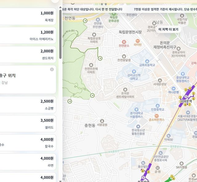 육개장 1000원, 샌드위치 2000원, 순댓국 3500원, 칼국수 4000원, 돈가스 4000원, 짬뽕 4900원 같은 구체적인 정보가 담겨 있다. 외식 물가가 비싸기로 알려진 강남이나 여의도 지역에서도 한 끼 1만원 이하 식당을 지도에서 찾을 수 있다.