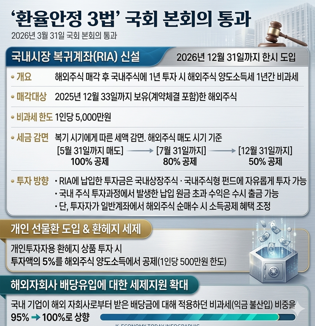 국회가 통과시킨 환율안정 3법은 해외주식 매도에 따른 양도소득세를 한시적으로 감면하는 내용을 담고 있다. 국내시장 복귀계좌(RIA)를 통해 국내 주식에 재투자할 경우 해외주식 매도분에 대해 5월 31일까지 100%, 7월 말까지 80%, 연말까지 50%의 공제율이 적용된다. 공제 한도는 매도금액 기준 5000만원이다.