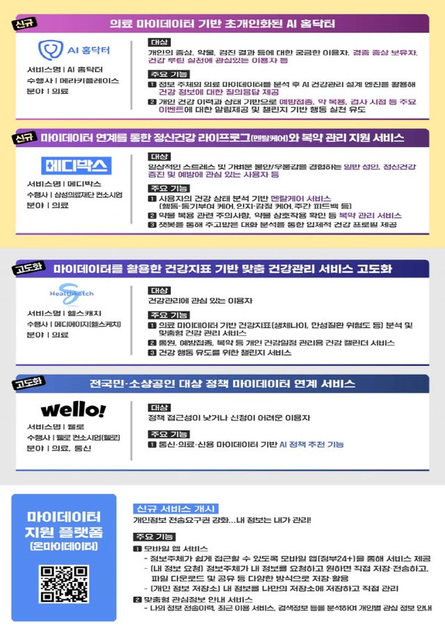 이번에 시연한 서비스는 △메라키플레이스의 ‘AI챗봇 기반 초개인화된 의료상담 서비스’ △삼성의료재단 컨소시엄의 ‘AI기반 대화형 멘탈 케어 서비스’ △메디에이지의 ‘건강정보 분석을 통한 맞춤형 건강관리 서비스’ △웰로 컨소시엄의 ‘나에게 맞는 정책 추천 서비스’이다.