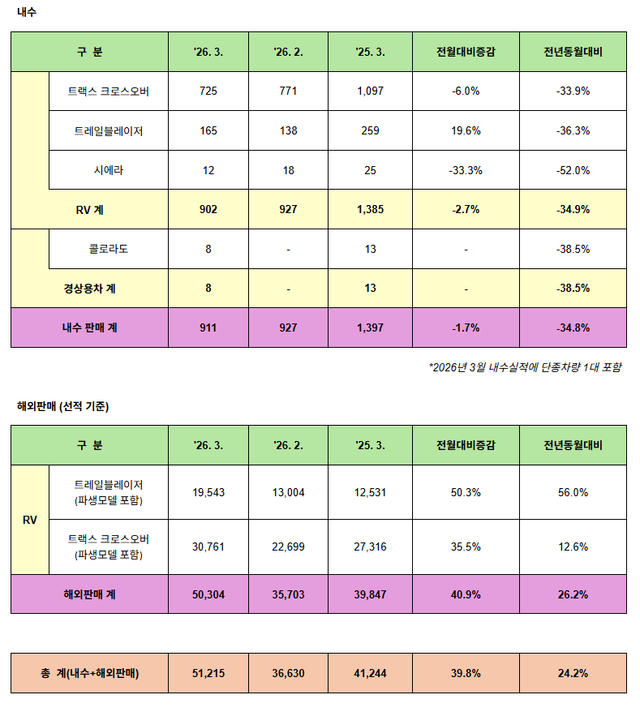 차종별로는 쉐보레 트랙스 크로스오버가 3만761대, 트레일블레이저가 1만9,543대 판매되며 실적을 이끌었다. 특히 트레일블레이저는 전년 대비 56.0% 증가하며 높은 성장세를 기록했다.