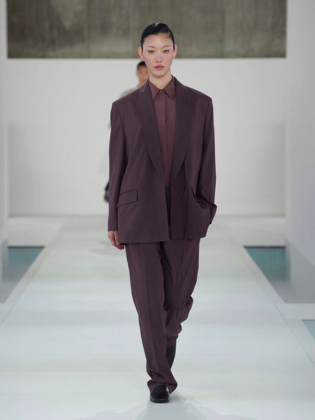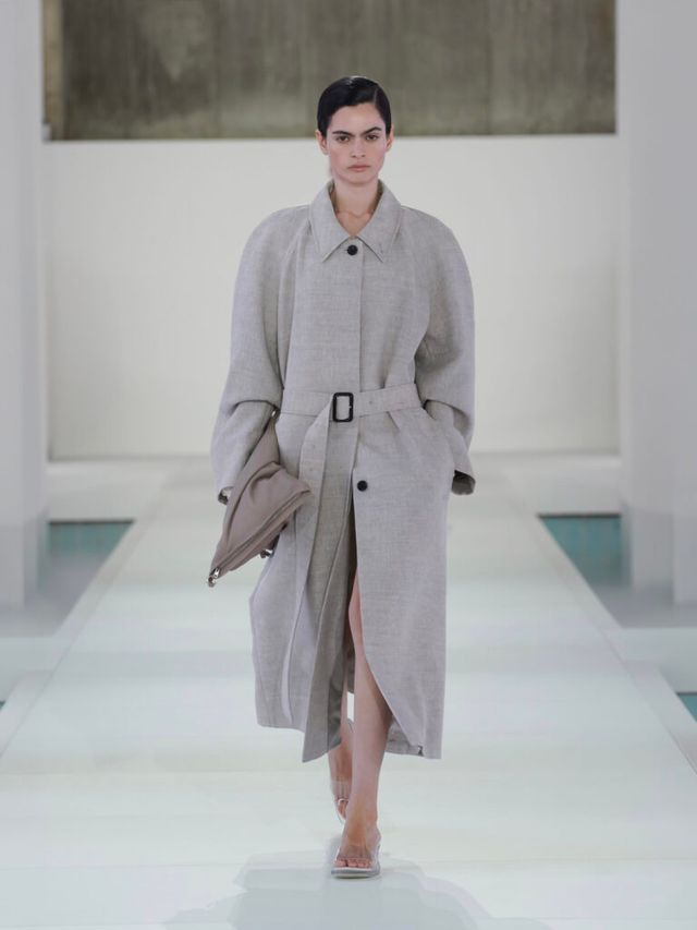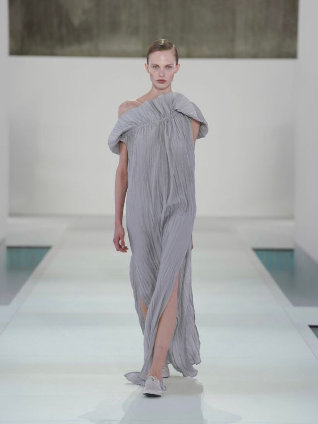 이어 1990년대 미니멀리즘을 떠올리게 하는 간결한 디자인의 룩들이 차례대로 등장했습니다. 슬레이트 그레이, 웜 브라운, 크림, 화이트 컬러를 중심으로 말이죠. 동시에 80년대 파워 드레싱을 연상시키는 파워 숄더도 눈에 띄었는데요. 테일러링은 유연한 소재와 절제된 드레이핑으로 새롭게 해석되었습니다. 흥미로운 착시 효과도 찾아 볼 수 있었습니다. 데님 셋업처럼 보였던 룩은 사실 실크 소재 위에 스티치 디테일을 적용한 디자인이었죠. 이는 ‘실물로 착각할 정도로 정밀하고 생생하게 묘사한 그림’이라는 뜻을 가진 프랑스어 트롱프뢰유(Trompe l’oeil) 기법으로, 소재에 대한 인식에 대해 다시금 생각해보게 만들었습니다.