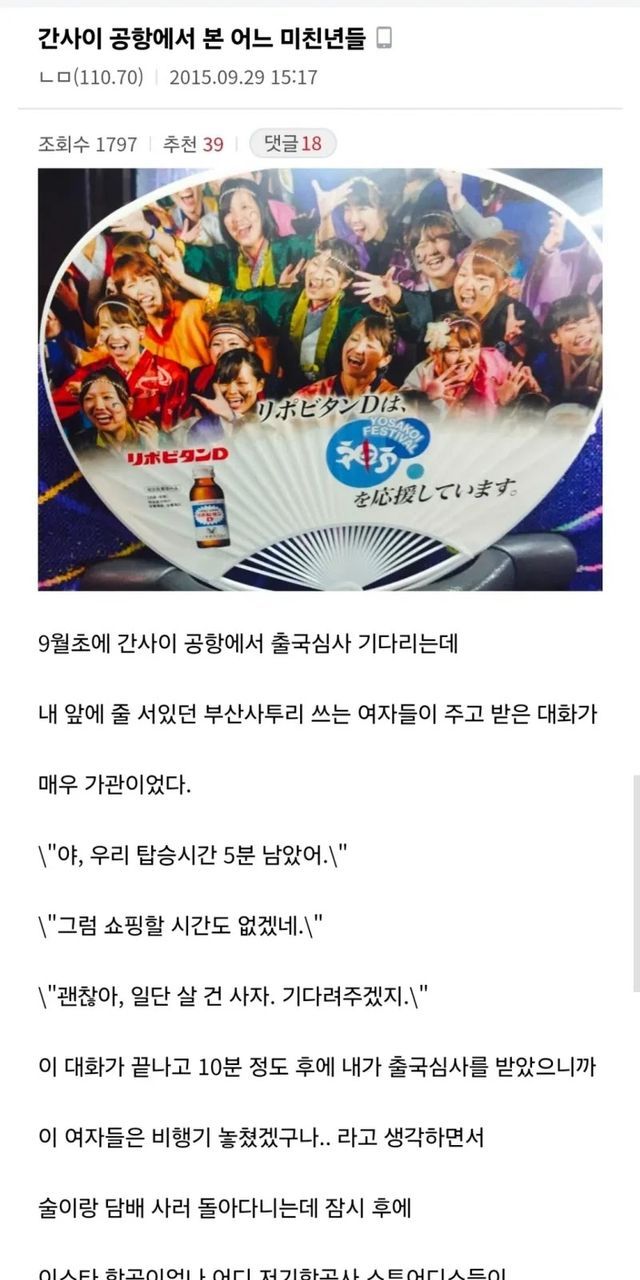 공개된 내용에 따르면 작성자는 9월 초 일본 간사이 공항 출국심사 대기 줄에서 부산 사투리를 사용하는 여성 일행의 대화를 듣게 되었다. 당시 상황은 비행기 탑승시간이 단 5분밖에 남지 않은 긴박한 시점이었으나, 해당 승객들은 "쇼핑할 시간도 없겠네"라는 말에 "괜찮아, 일단 살 건 사자. 기다려주겠지"라며 쇼핑을 강행하려는 태도를 보였다. 이러한 사고방식은 항공 시스템의 정시성과 타 승객의 권리를 전혀 고려하지 않은 전형적인 이기주의적 발상으로 볼 수 있다. 대화가 끝난 후 작성자가 출국심사를 마치고 면세 구역으로 들어갔을 때, 실제로 항공사 승무원들이 해당 승객들을 찾기 위해 공항 내부를 뛰어다니는 모습이 목격되기도 했다.