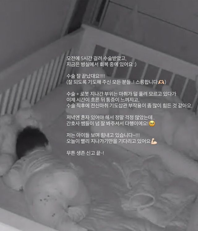 추가로 그는 “저녁에 혼자 있어야 해서 정말 걱정 많았는데 간호사 쌤들이 너무 잘 봐주셔서 다행이다”라며 “저는 아이들을 보며 힘내고 있다. 아무튼 생존 신고 끝”이라며 수술 이후 근황을 전했다.